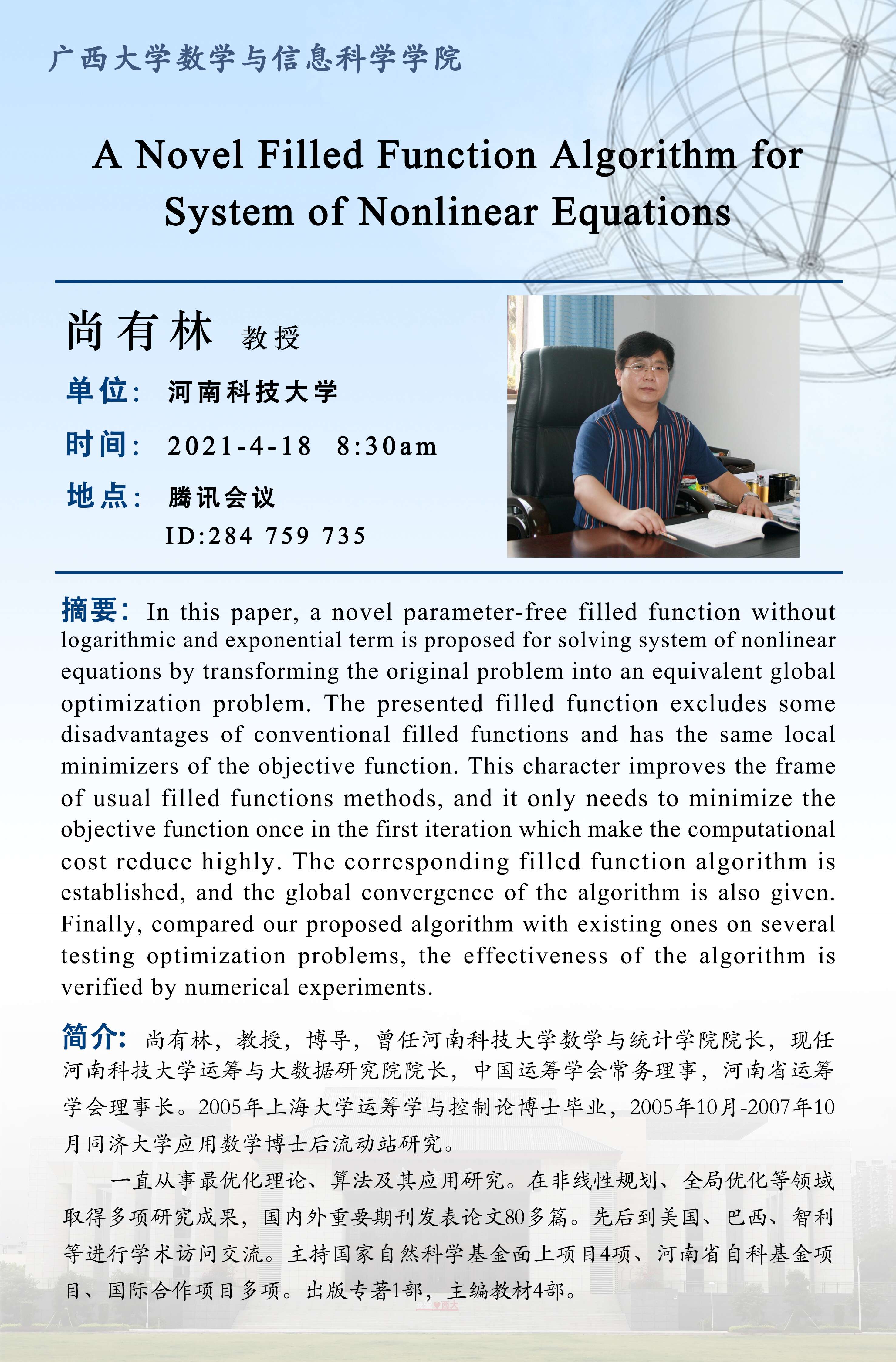 数学与信息科学学院学术报告:A Novel Filled Function Algorithm for System of Nonlinear Equations