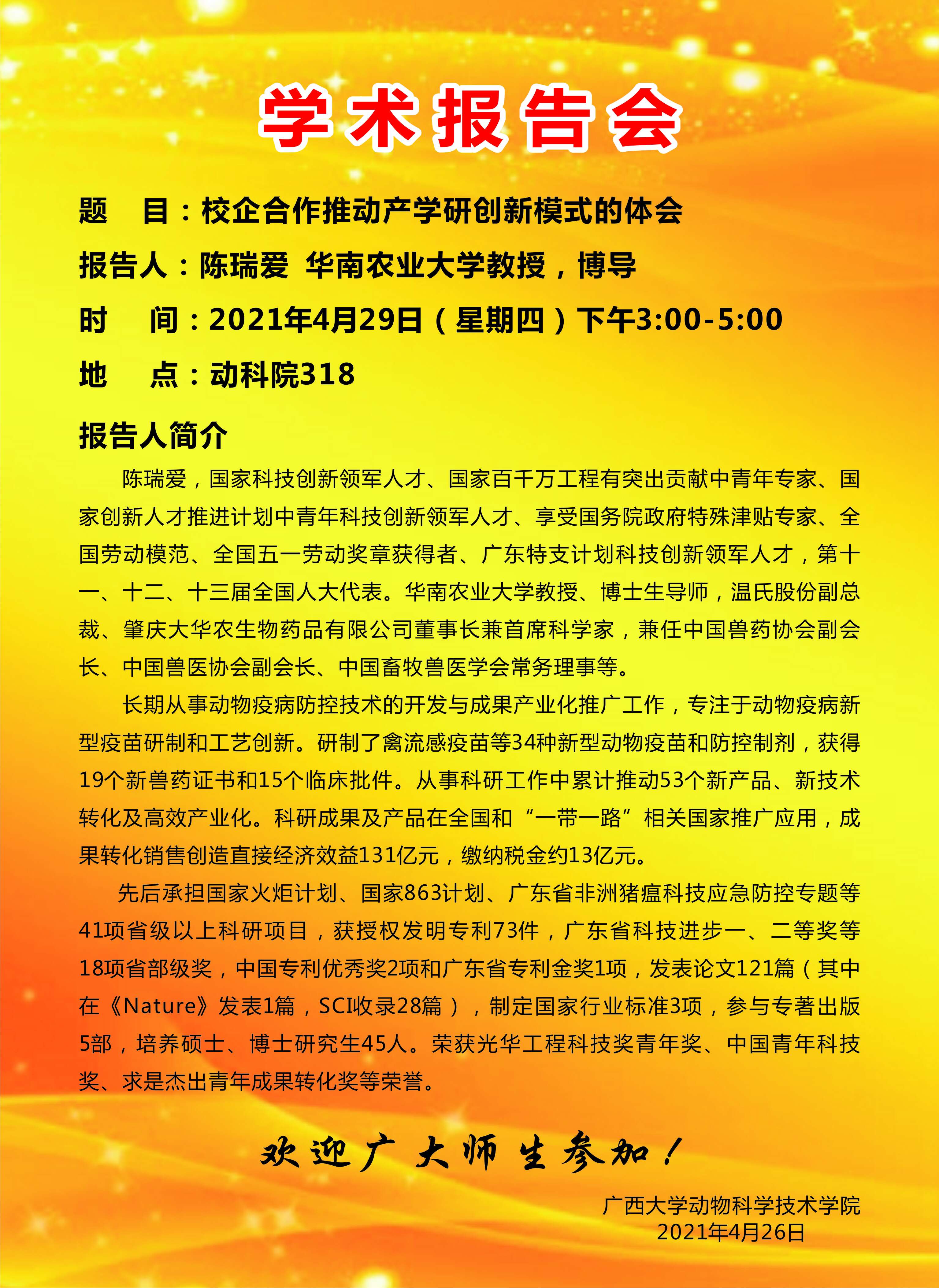 动物科学技术学院学术报告:校企合作推动产学研创新模式的体会