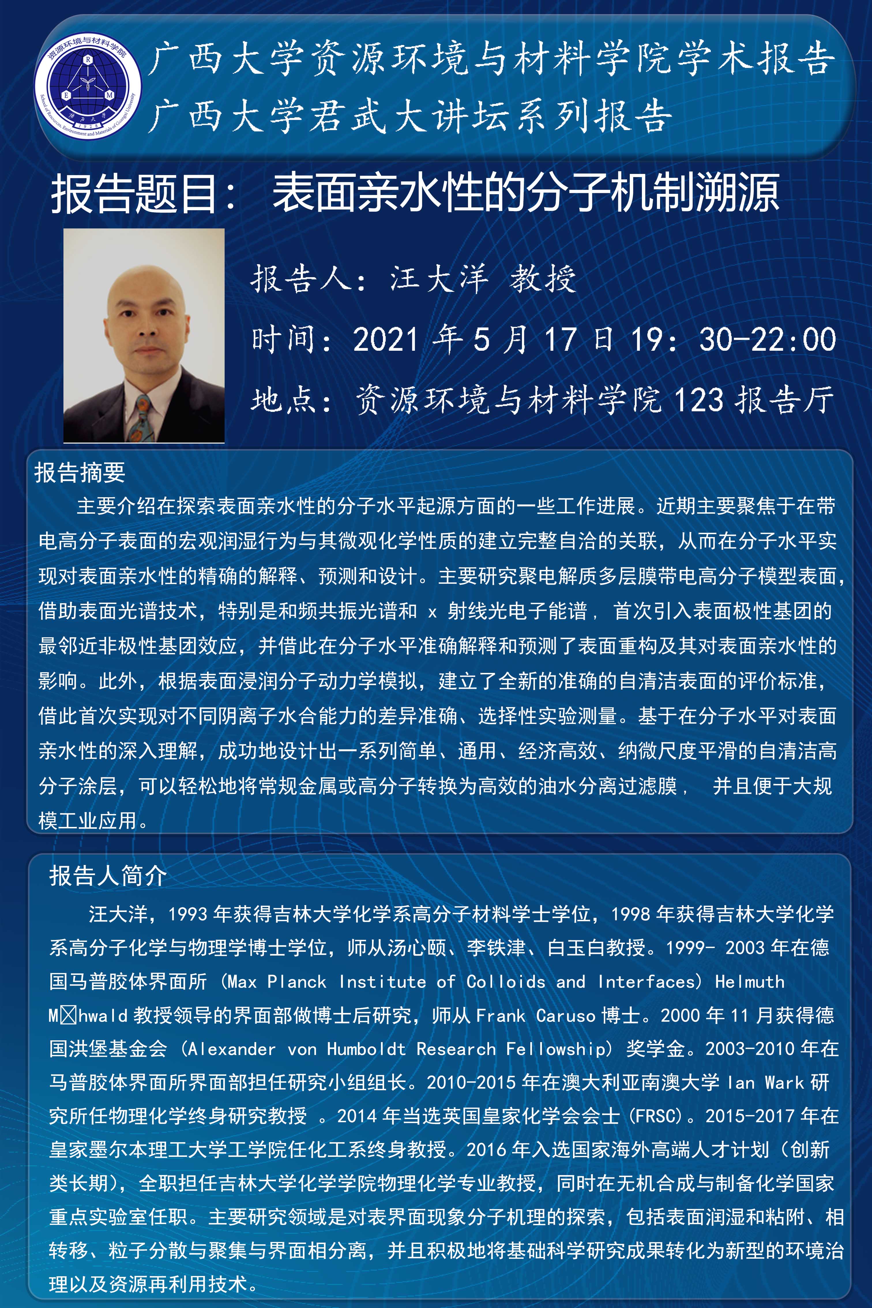 君武大讲堂-资源环境与材料学院学术报告:表面亲水性的分子机制溯源