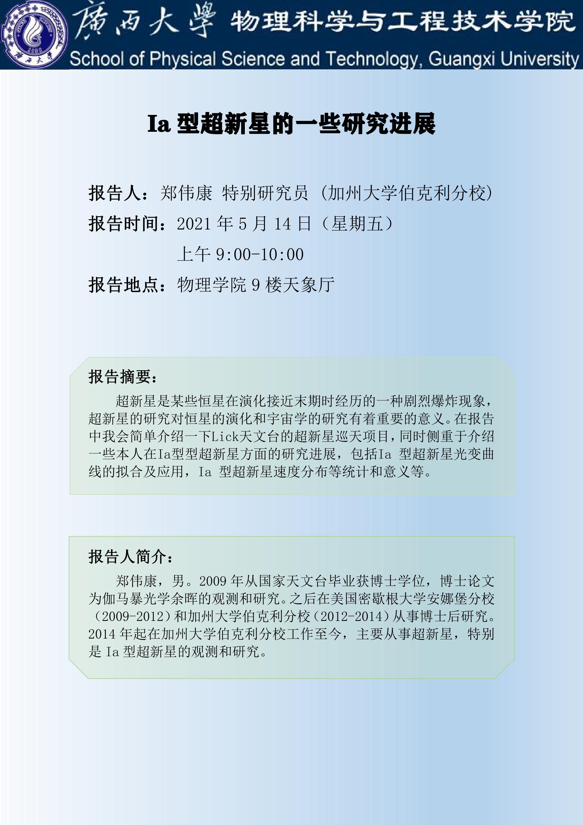 物理科学与工程技术学院学术报告:Ia型超新星的一些研究进展
