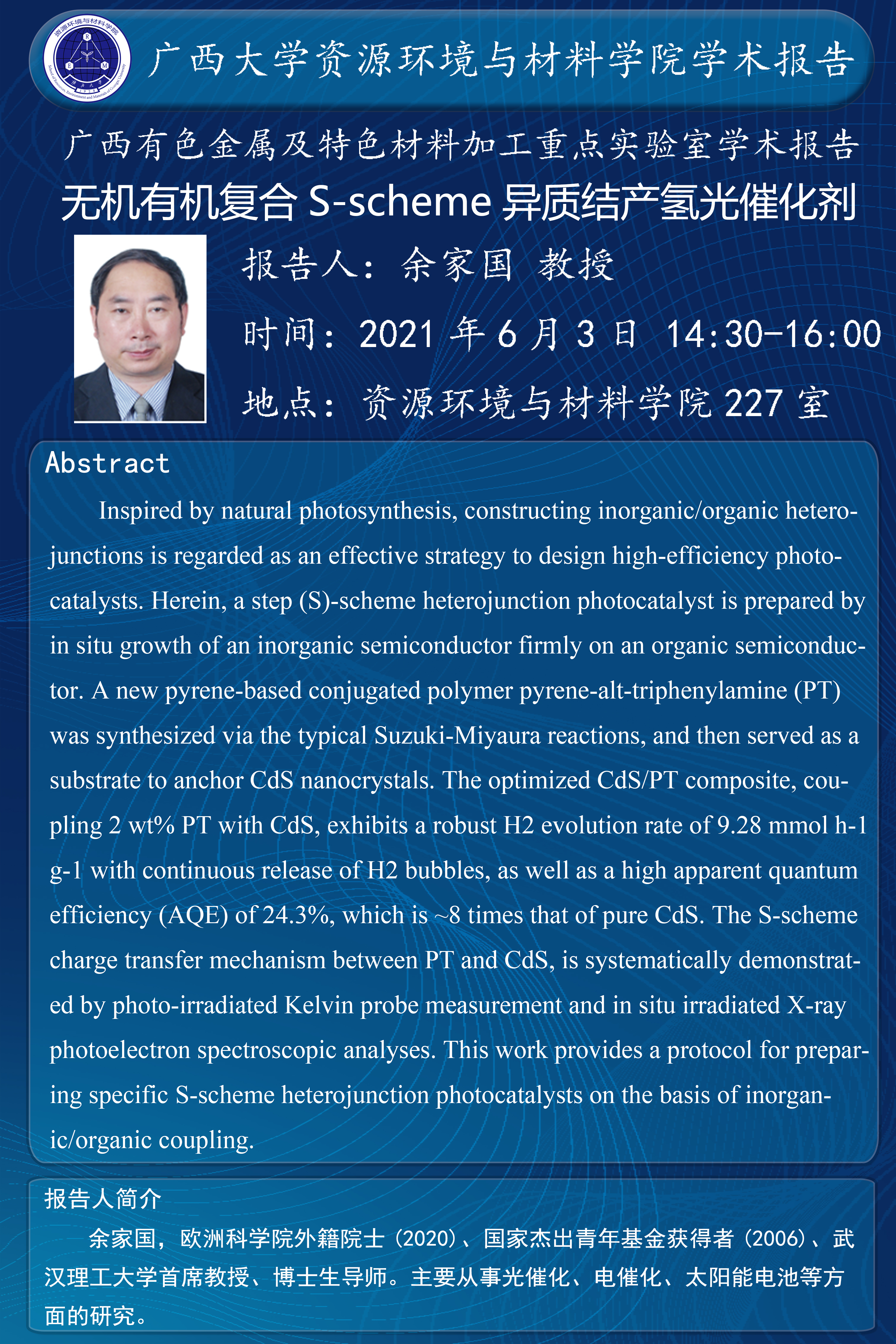 资源环境与材料学院学术报告:无机有机复合S-scheme异质结产氢光催化剂
