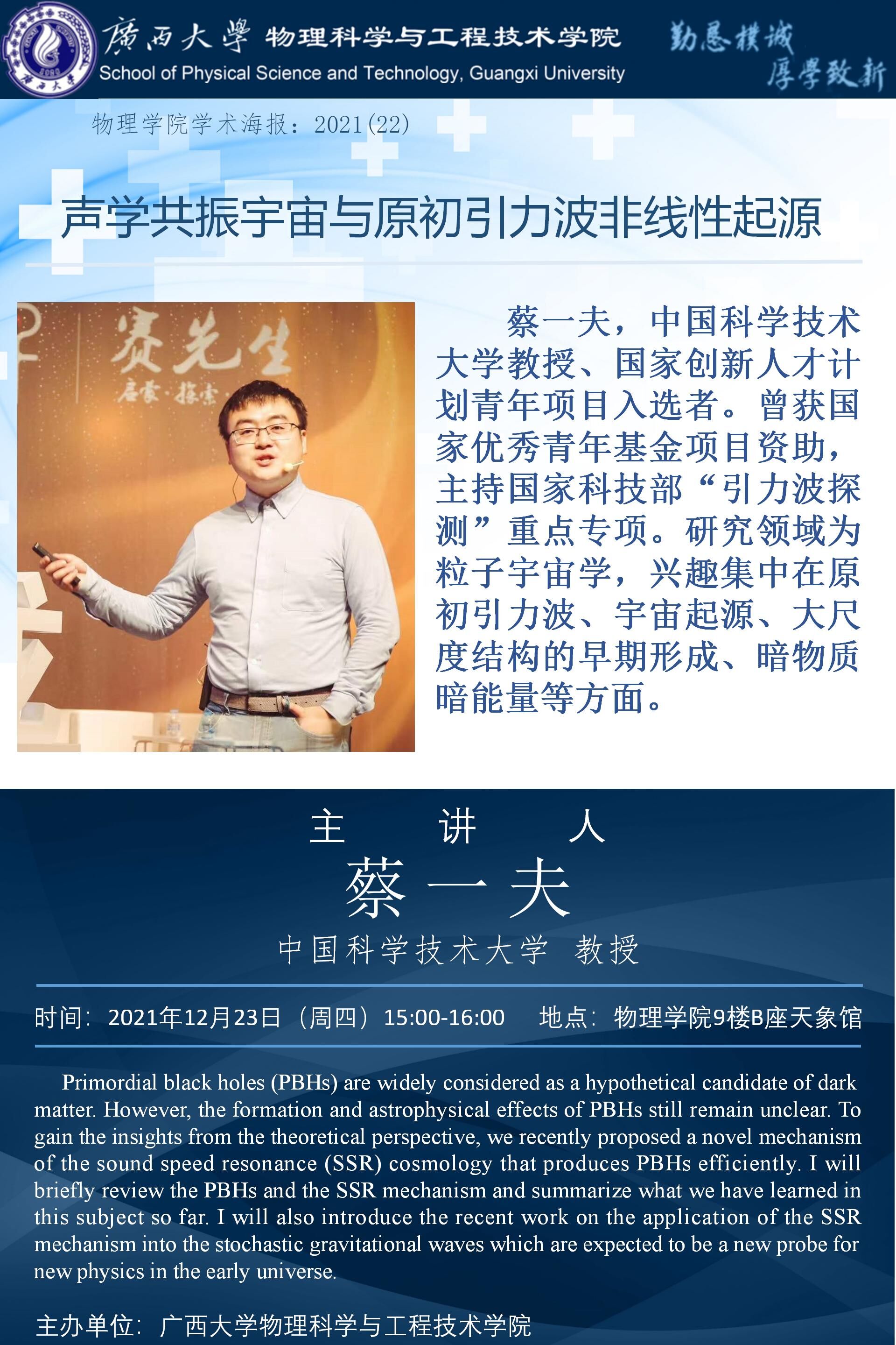 物理学院学术报告: 声学共振宇宙与原初引力波非线性起源