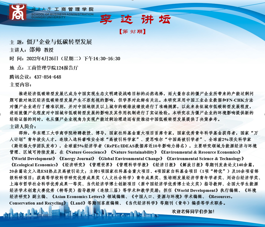 工商管理学院“李达讲坛”:僵尸企业与低碳转型发展