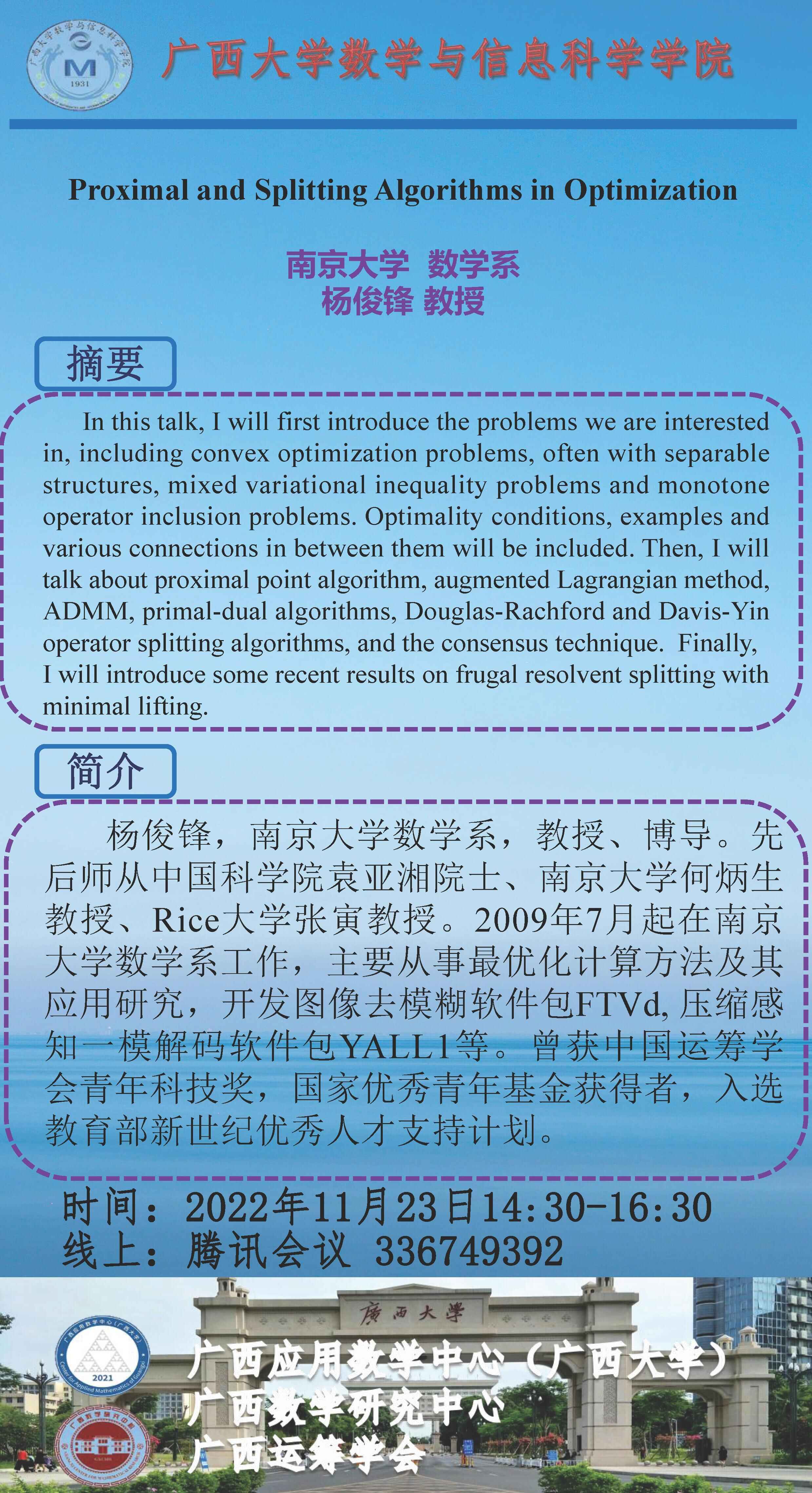数学与信息科学学院/广西应用数学中心(米兰电竞,洞察赛局趋势,定义电竞美学)学术报告Proximal and Splitting Algorithms in Optimization