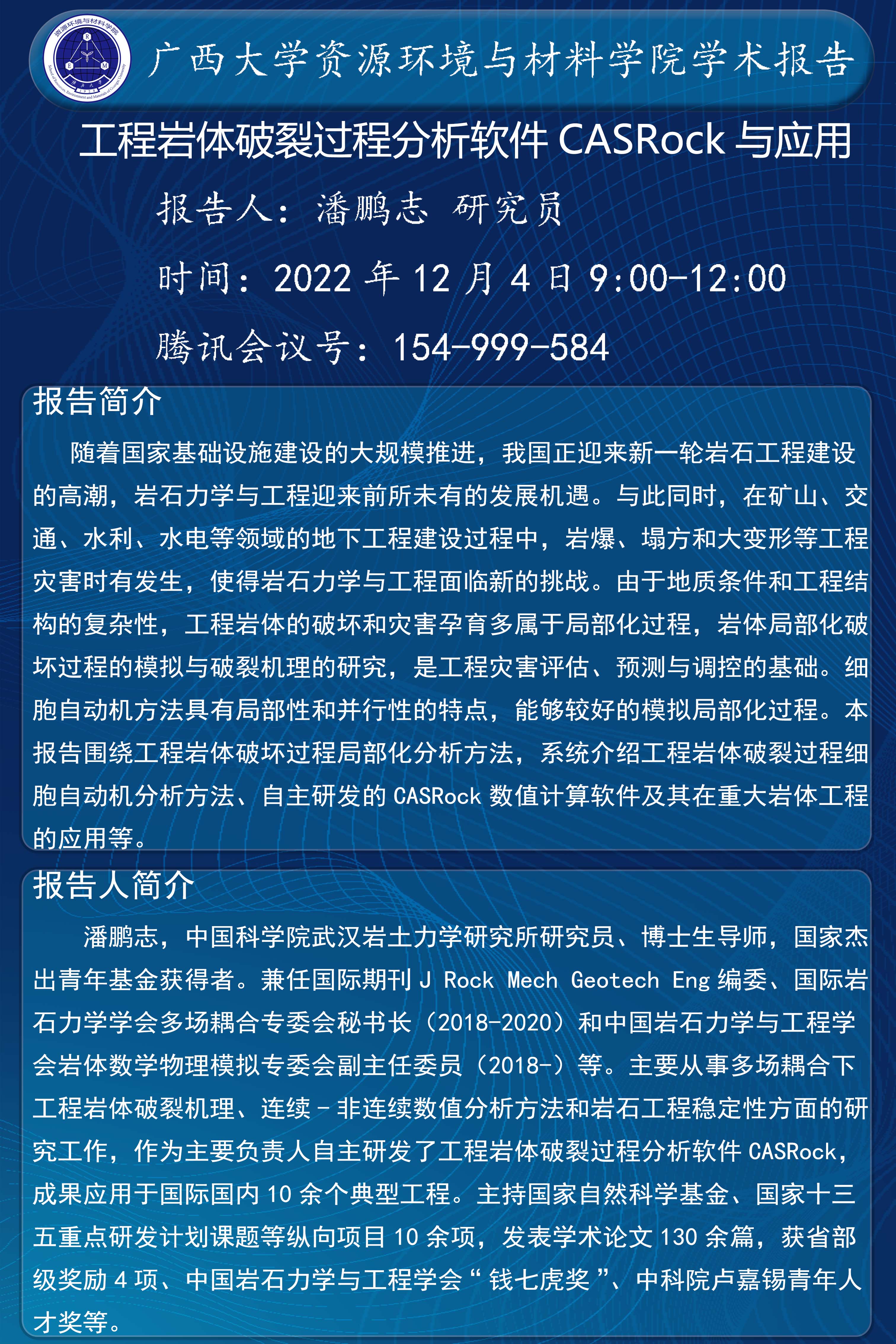 资源环境与材料学院学术报告 工程岩体破裂过程分析软件CASRock与应用