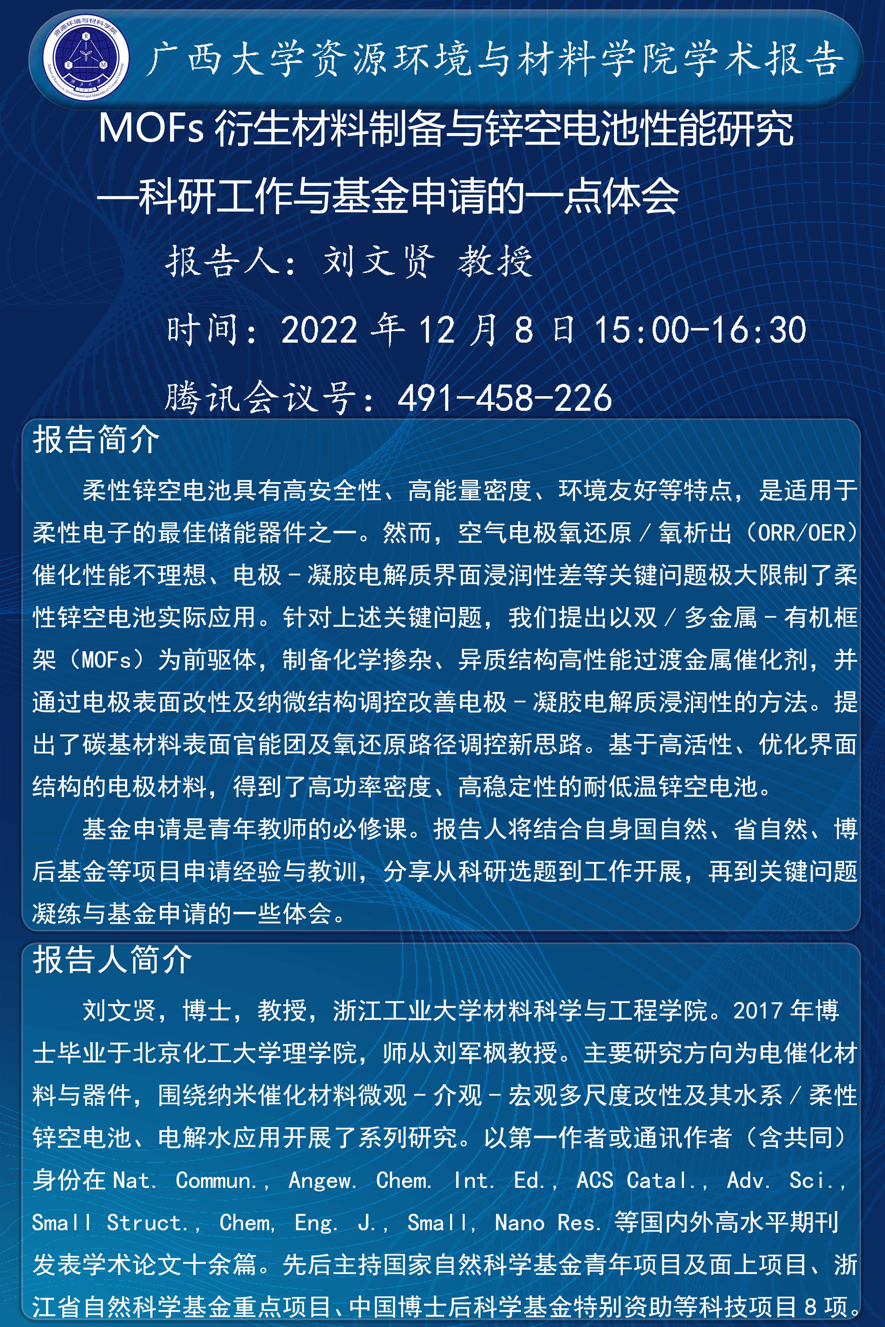 资源环境与材料学院学术报告 MOFs衍生材料制备与锌空电池性能研究—科研工作与基金申请的一点体会