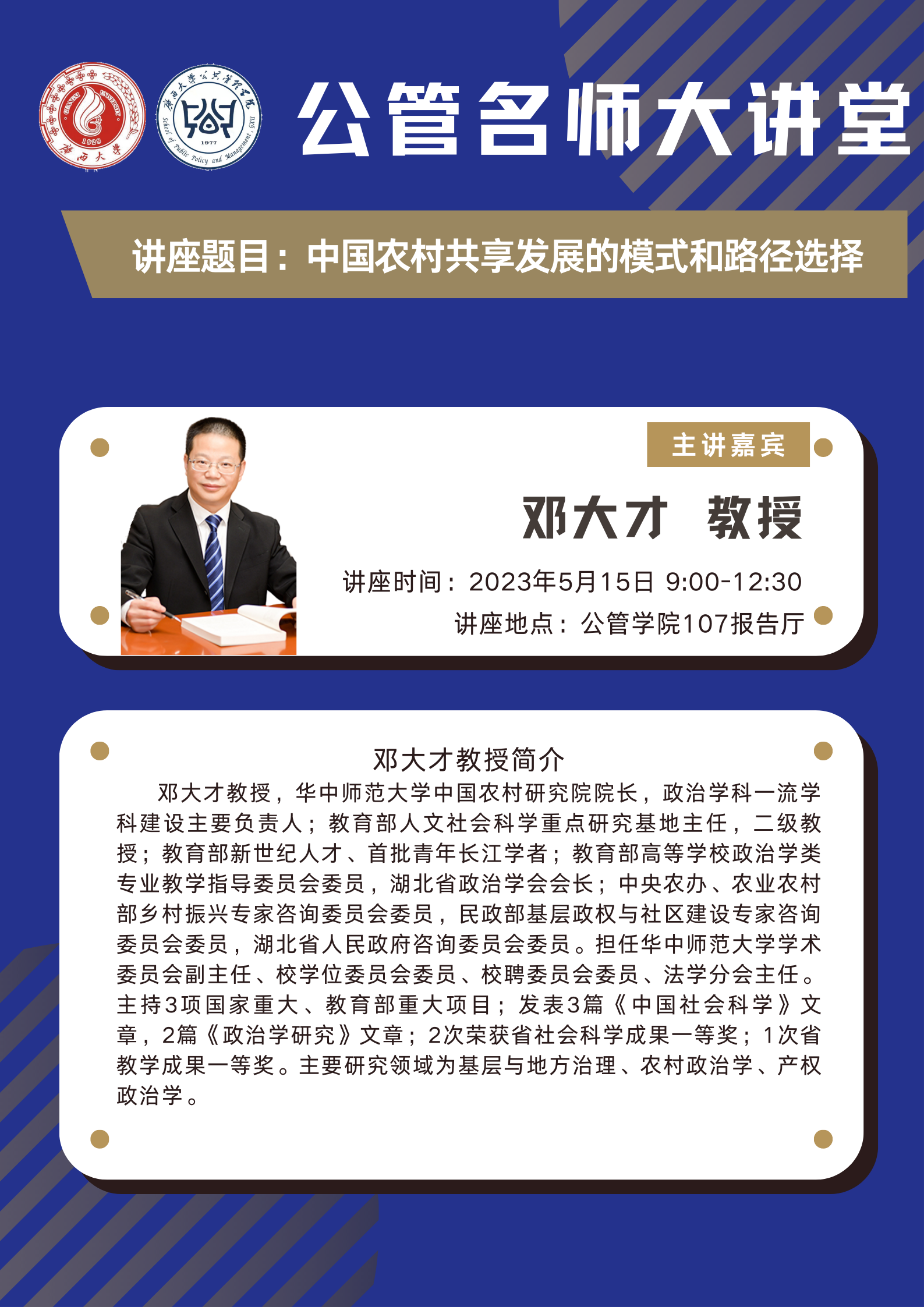 邓大才教授,华中师范大学中国农村研究院院长, 政治学科一流学科建设主要负责人;教育部人文社会科学重点研究基地主任,二级教授;教育部新世纪人才、首批青年长江学者;教育部高等学校政治学类专业教学指导委员会委员,湖北省政治学会会长;中央农办、农业农村部乡村振兴专家咨询委员会委员,民政部基层政权与社区建设专家咨询委员会委员,湖北省人民政府咨询委员会委员。担任华中师范大学学术委员会副主任、校学位委员会委员、校聘委员会委员、法学分会主任。主持3 项国家重大、教育部重大项目;发表3 篇《中国社会科学》文章,2 篇《政 治学研究》文章;2 次荣获省社会科学成果一等奖;1 次省教学成果一等奖。主要研究领域为基层与地方治理、农村政治学、产权政治学。