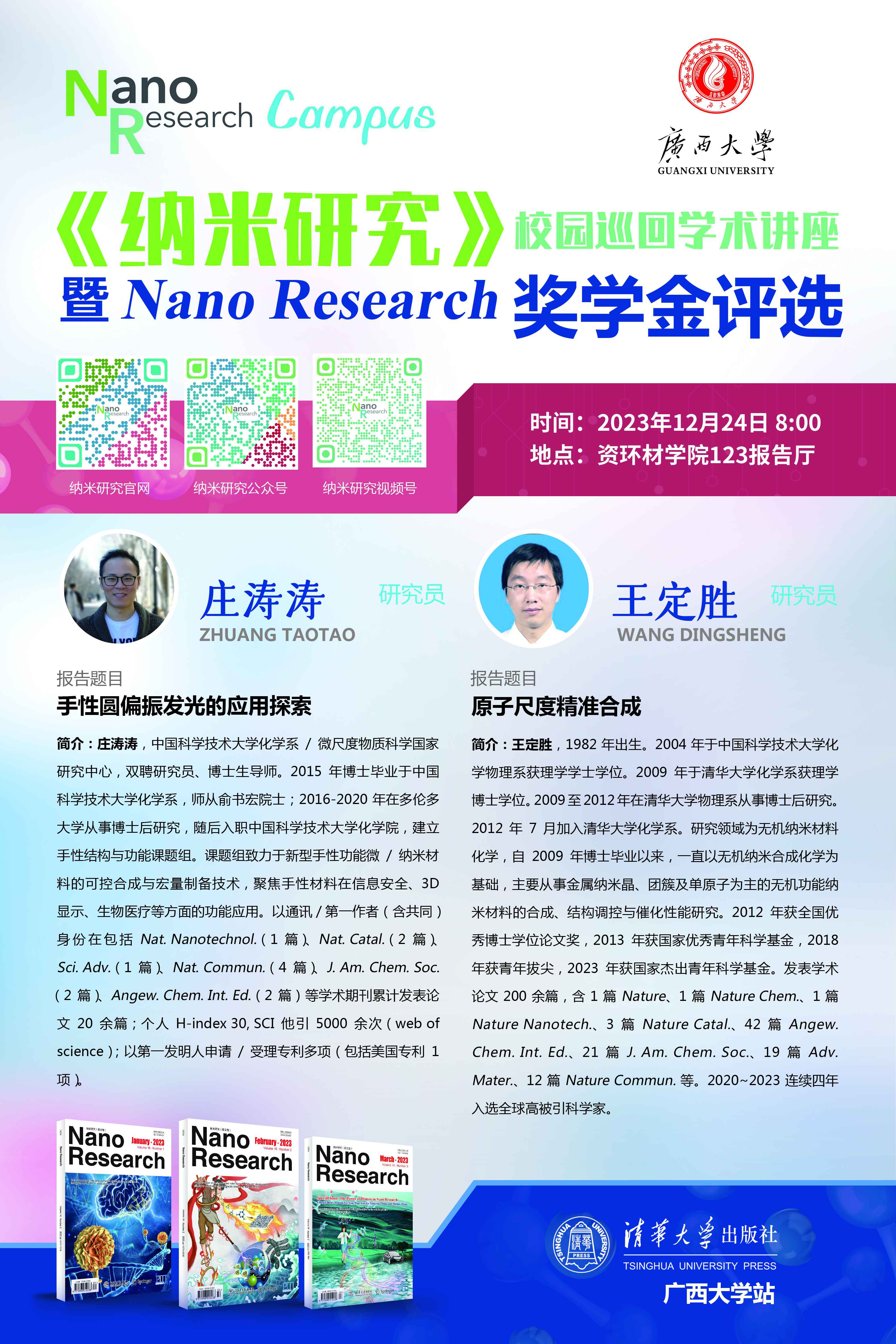 资源环境与材料学院学术报告、《纳米研究》校园巡回学术讲座:1.手性圆偏振发光的应用探索;2.原子尺度精准合成