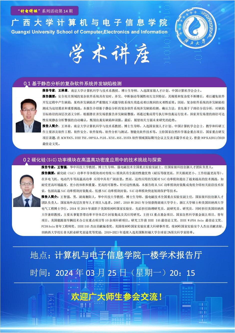 计算机与电子信息学院学术报告:1.基于静态分析的复杂软件系统并发缺陷检测 ;2.碳化硅(SiC)功率模块在高温高功密度应用中的技术挑战与探索