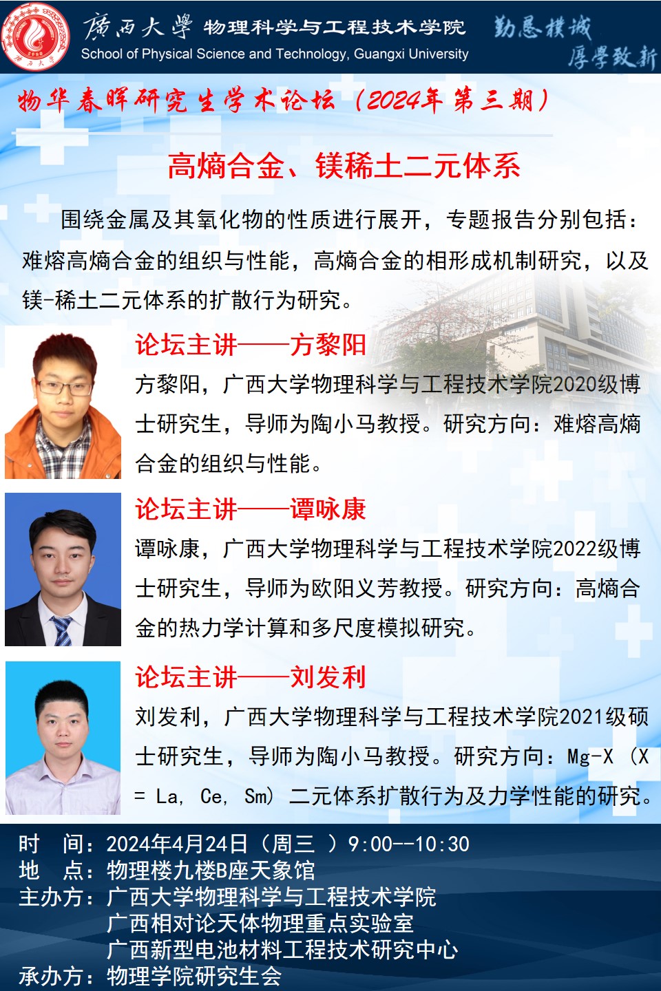 物理学院2024年物华春晖学术论坛(第三期):高熵合金、镁稀土二元体系