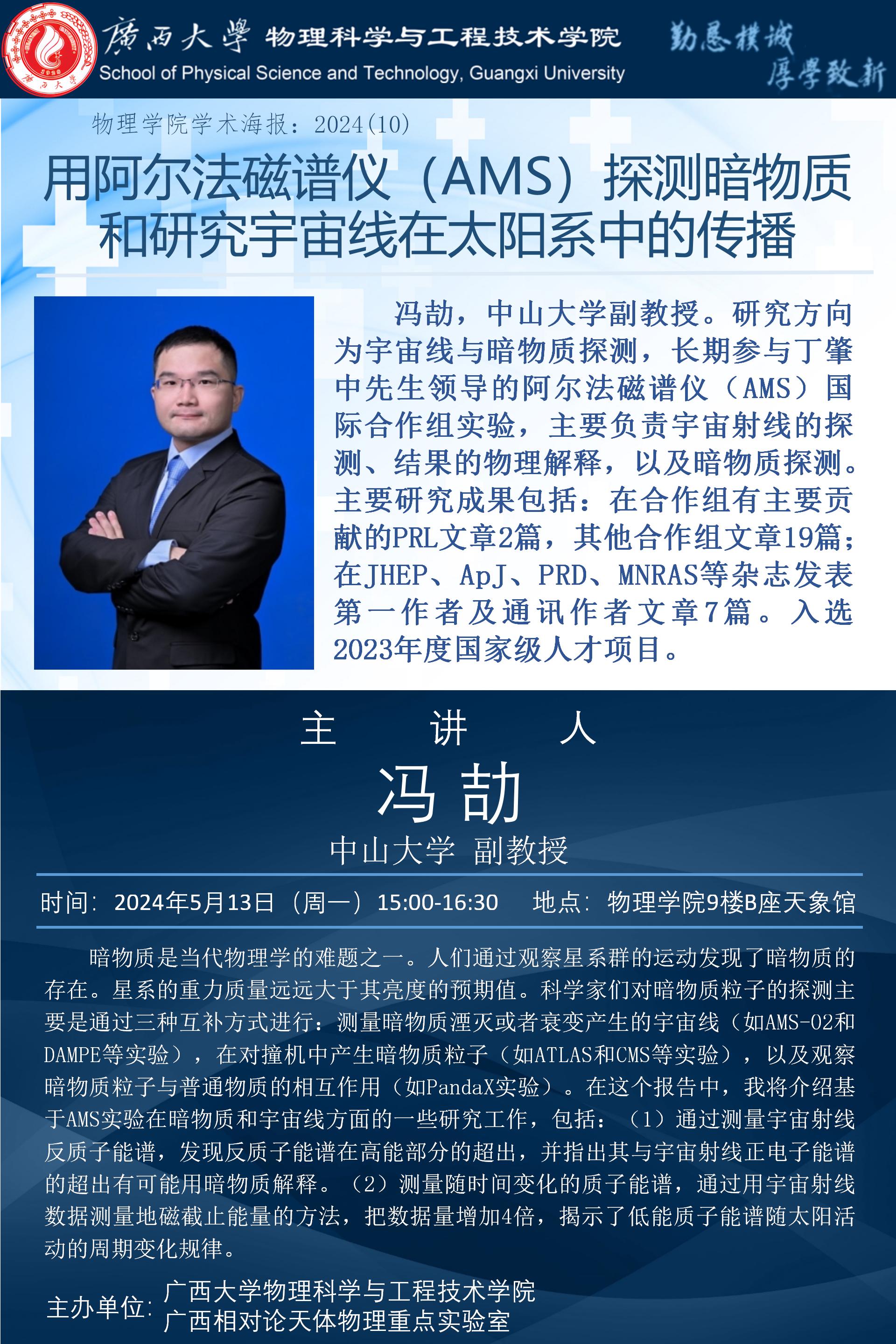 物理学院2024年学术报告之10:用阿尔法磁谱仪(AMS)探测暗物质和研究宇宙线在太阳系中的传播