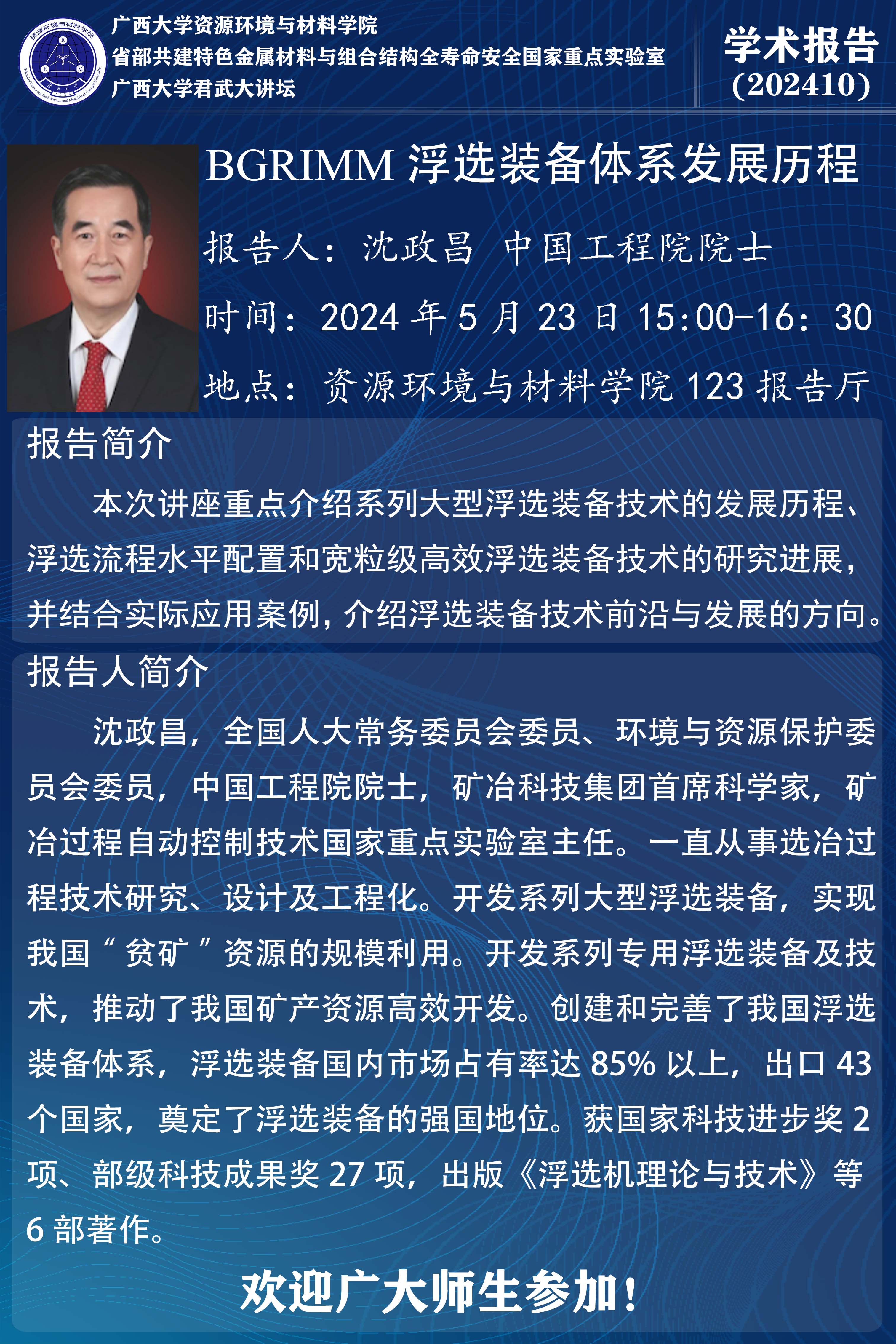 君武大讲坛、资源环境与材料学院学术报告:BGRIMM浮选装备体系发展历程