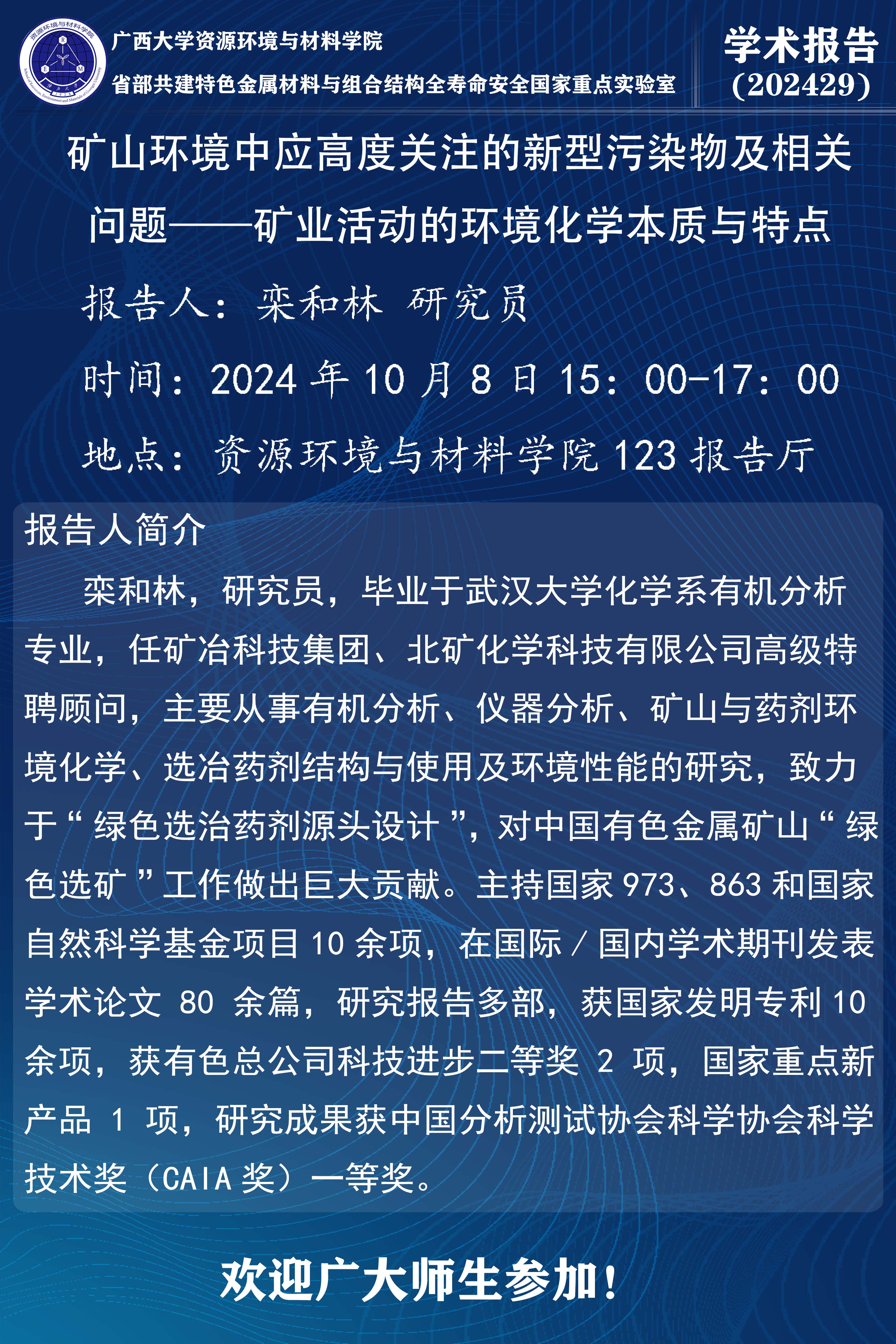 资源环境与材料学院学术报告:矿山环境中应高度关注的新型污染物及相关问题——矿业活动的环境化学本质与特点