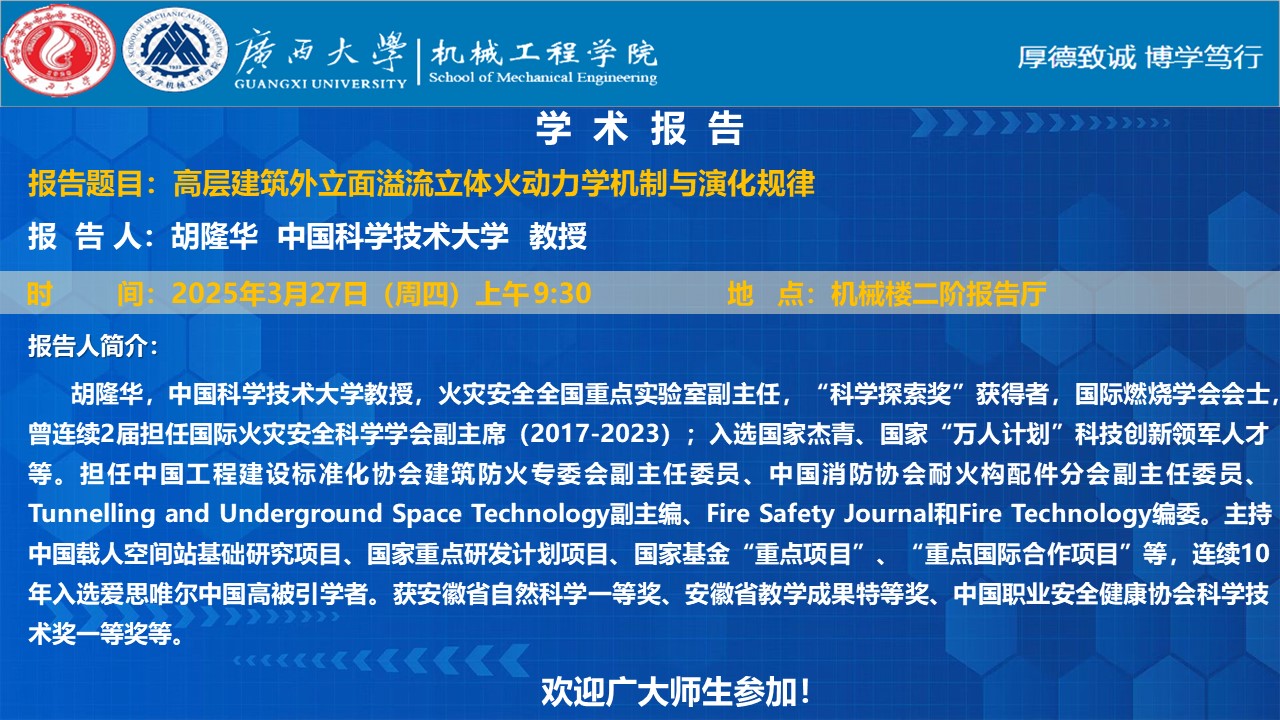 机械工程学院学术报告:高层建筑外立面溢流立体火动力学机制与演化规律