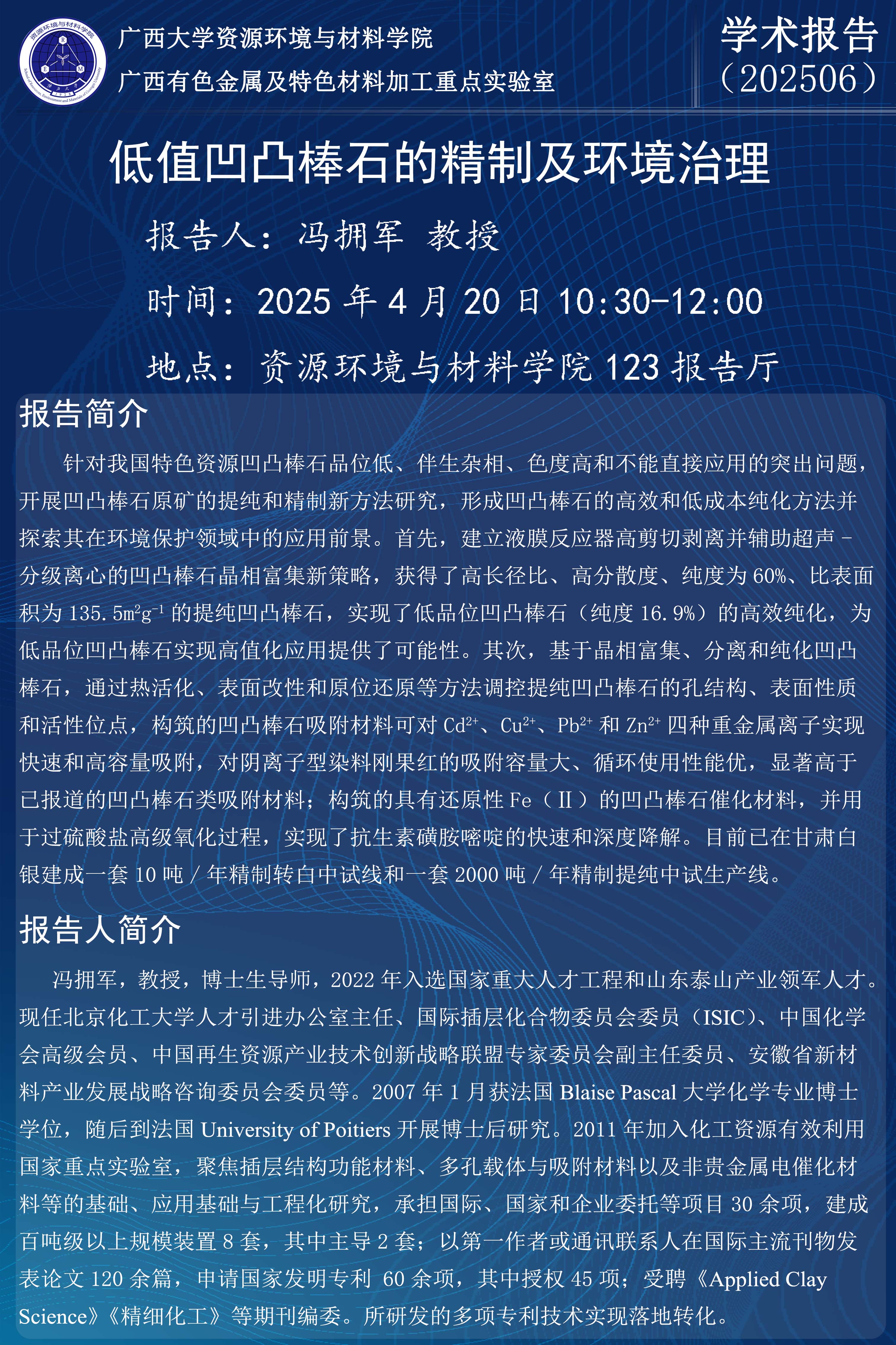 资源环境与材料学院学术报告:低值凹凸棒石的精制及环境治理中的应用