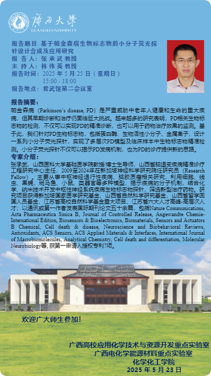 化学化工学院学术报告:基于帕金森病生物标志物的小分子荧光探针设计合成及应用研究