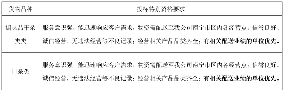 3.2具有生产、加工或销售的相关资质,生产、加工企业必须具备所投标产品的《食品生产许可证》(初级农产品除外),销售商必须具备所投标产品的《食品经营许可证》或经食品监督部门备案的《仅销售预包装食品经营者备案信息采集表》。