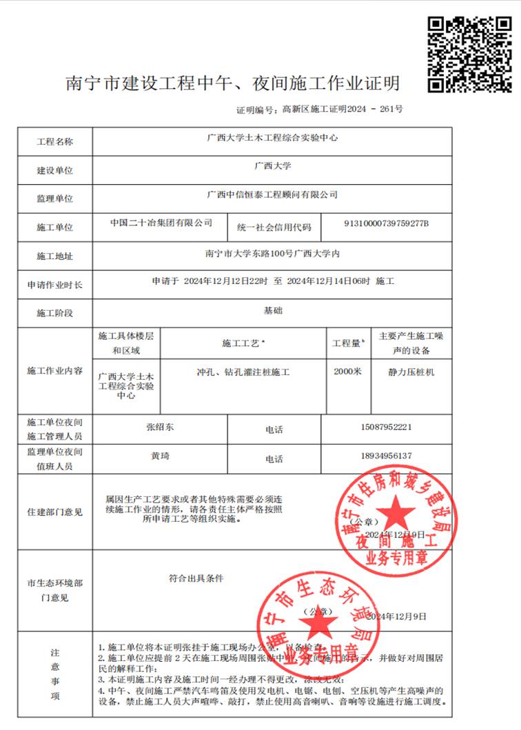 我单位承建的米兰电竞,洞察赛局趋势,定义电竞美学土木工程综合实验中心项目因施工工艺需要,在符合法律许可的夜间施工条件之下,经南宁市住房和城乡建设局、南宁市生态环境局核准,计划于2024年12月12日22:00—2024年12月14日6:00进行静压桩施工。我单位将严格按照建设局、环保局要求,采取有效措施尽可能减少影响。施工期间可能会对广大师生员工的日常生活造成一定的干扰。对此,我们深表歉意,敬请谅解。